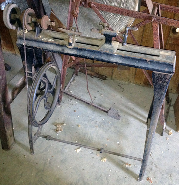 But enough of my historical reflections fueled by my recent re-reading of Sinclair’s “The Jungle”. The lathe pictured is a late 1800s model that could have sat in the parlour of any Victorian home or possibly in the traveling kit of the road salesman ready to demonstrate to the wanting masses. It sits in cold storage at The Steppingstone Museum gathering dust. Given the rags to riches history of woodturning, this seems somehow criminal to me. I will be restoring it to working order and we have the spare parts laying about amongst a literal mound of old tools. It needs a lot of work but a good cleaning will go a long way. This lathe is elegant in its weight and shape and features everything the Victorian enthusiast would want to shape the wood then buff it to a high shine with the outboard buffing wheel. This same wheel could be swapped for a grind stone to maintain the turning tools as well. The treadle isn’t pictured but it is what we would now call a sewing machine pedal style with intricate iron scrollwork. The tiny flywheel is solid iron and carries with it a fair amount of momentum to effortlessly power the work especially when you consider that the centers only have 3″ of clearance. I can’t wait to get her running again and see how it works. It will make an excellent hands on exhibit at the Steppingstone Museum for everyone to give it a try.
