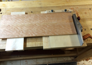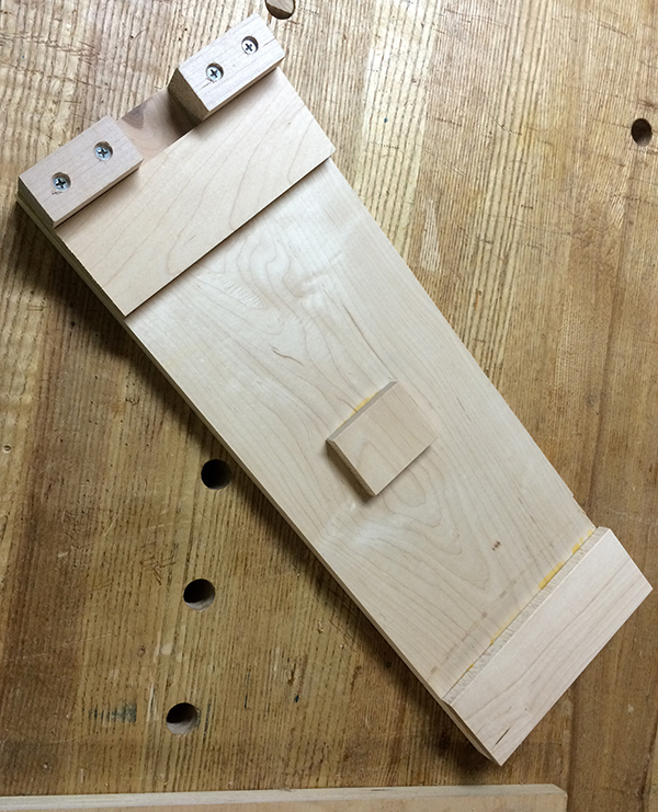 First I needed to create a support for the panel shooter. I needed a hook that was more than 1.5″ thick to bring it level with the shooting board. I didn’t have any scrap that would match that thickness and I wasn’t going to pull a fresh board from the shed and start planing it down to that thickness. So I improvised and just glued some blocks onto the bottom of a 1″ thick board then screwed a cleat to it. Ta da, 5 years of making do with this shooting board and I fixed it in 5 minutes. Why the heck didn’t I do this years ago.