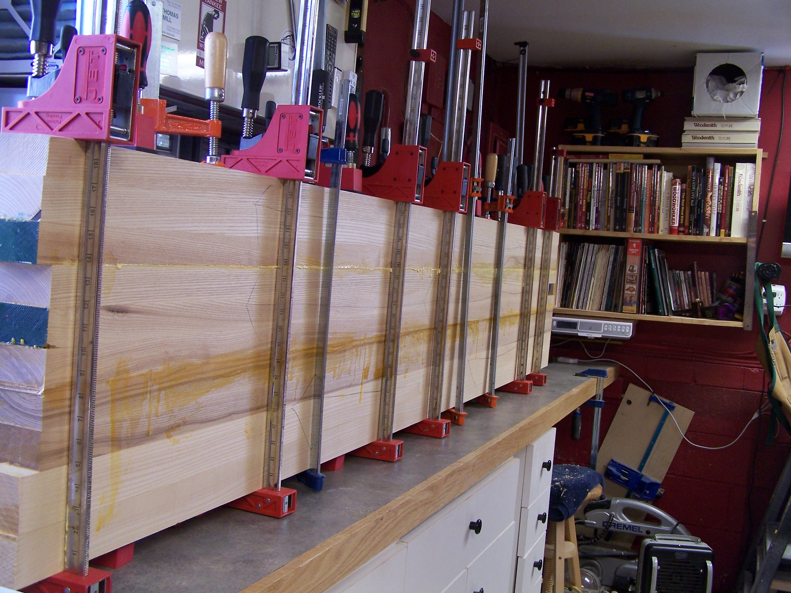 This week the Roubo saga continues as I move on to gluing up all the laminates for the top. This was a lot of work which mostly entailed heavy lifting. Several sore muscles and one smashed finger later and my benchtop is ready for the end vise installation.