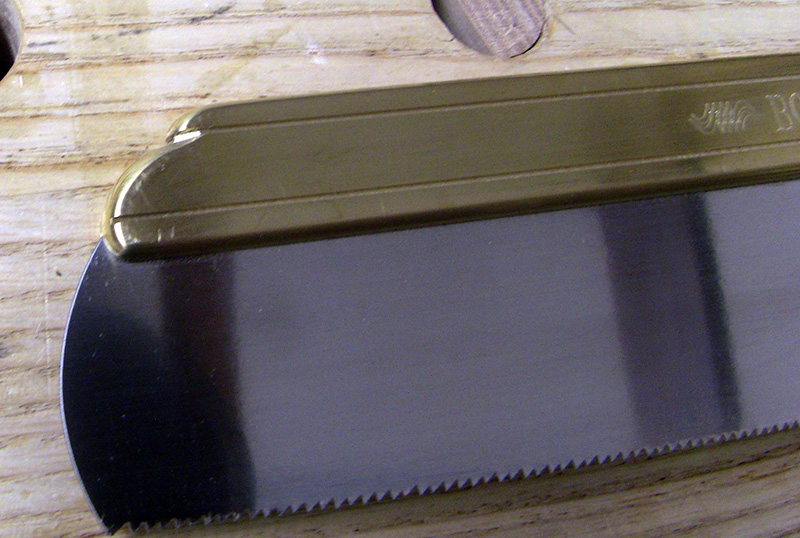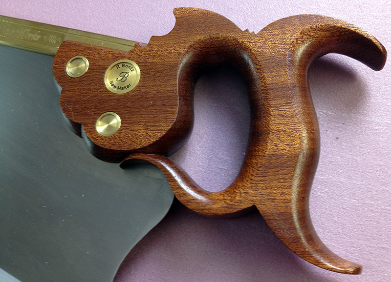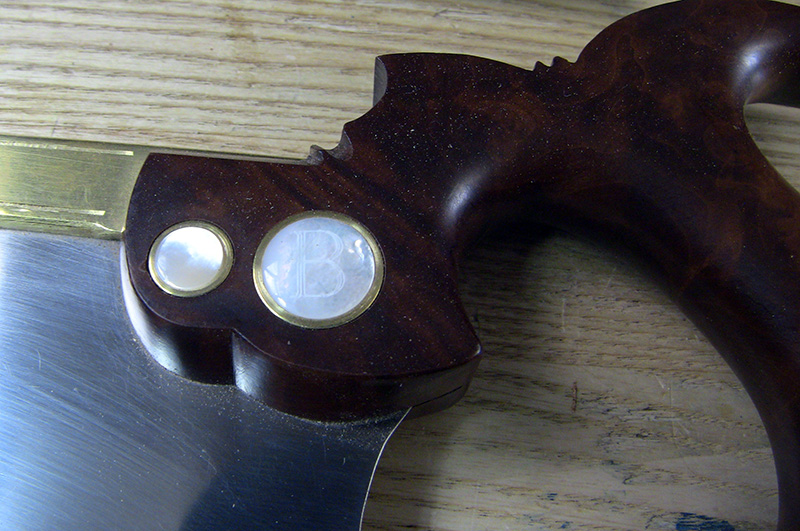 While this has nothing to do with the performance of these saws, I’m starting here because this is the first thing you will notice about a Bontz saw. They are works of art! Mother of Pearl medallions rimmed in brass. Art Deco styled brass backs, elegantly engraved. Beautifully shaped saw plates with more attractive curves than a cover model and even sometimes pierced stylings (the saws, not the models). Meticulously shaped handles in highly figured woods. These are found in every saw Ron produces. At first glance you seriously consider framing the saw and hanging it on the wall. Fight the temptation of the closet saw painter and put this saw to work.