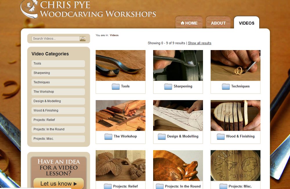 Woodcarving Video InstructionAfter spending several hours reviewing Chris’ lessons I am really excited by what he is doing over there. Chris Pye is a reknown woodcarver with decades of experience and a body of work that is astounding so there really is no doubt he knows his stuff. Expertise is one thing but being able to convey the message is an entirely different trait. It is obvious Chris has years of teaching experience too as his presentation style is spot on. The site is broken into categories of information and a logical progression of quick 2-5 minute, high quality videos covers each topic. There is no detail uncovered and the site navigation is excellent putting everything right at your fingertips. Once fundamentals are covered Chris has jumped into several multi-part project videos where the student can apply the basics.