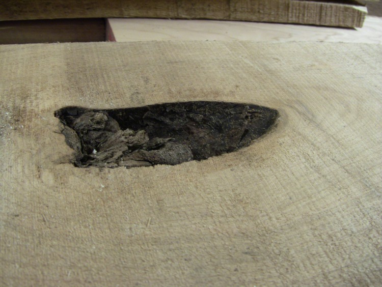 Cherry Knot used as a design elementMaybe this “defect” is really just an opportunity. I think that there is a way to embrace this knot hole and make it a feature in a table top. Imagine creating a spot for a built in Ikebana style flower arrangement growing right out of the top. Or fill the hole with clear resin and encase something within it. The swirling grain around the knot makes me think of a Zen rock garden so I have visions of turning the knot into a tiny Koi pond and highlighting the grain around it. Even just leaving the knot open and planing the board until you get a through hole would make for a real point of interest in a top while making it clear to the casual observer that this piece came from a tree.  You could use this as a door panel that provides a sneak peek of what is inside the cabinet. Maybe I have been reading Nakashima too much lately, but I’m really excited by the opportunity presented by this “defect”.