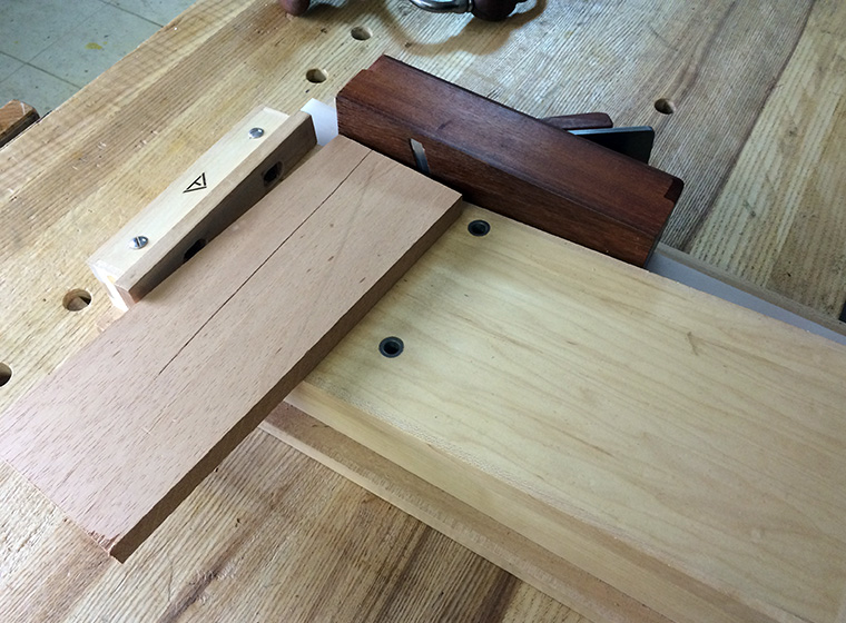 So I fall back on the fundamental skills and put the shooting board back under the workbench and grab a block plane. I need to flatten the joinery face and square it, then create a narrow face at the top of the leg that is square to the joinery face. This second face will mostly be hidden inside the sliding dovetail but a small portion is visible and needs to mate cleanly with the column. I find this kind of detail work to be really soothing. No jigs, just freehand work with the plane (though I suppose a plane is a jig right?) where I take a pass check with a square and take another until I have refined the face. It reminds me just how important it is to be able to execute the fundamental skills that lay beneath the fixtures, appliances, and jigs that we create to make our work easier.