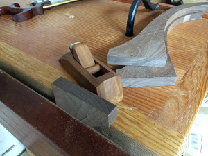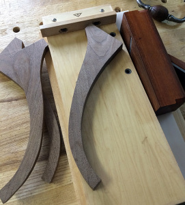 The legs for this tripod table have no reference faces once the shape is sawn out. I must saw it out first since I need to position the legs so the long grain runs along the entire length of it for the best strength. Do I build a special jig for my shooting board that will hold the work piece at the perfect angle or compound angle? This seems like a lot of extra work that could only lead to compounded errors. I suppose if I had a whole bunch of ends to do, but with only 3 legs it just seems silly and definitely a lot slower. Since I need two flat and square faces I suppose I could use the shooting board for the second face but I still have to flatten and square the first face and that won’t work on the board.