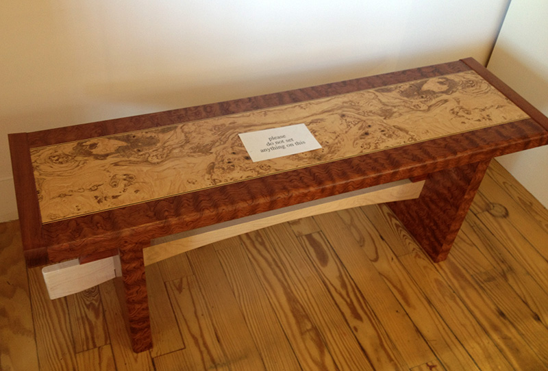 The pieces seen here are just a few from a gallery that I ran across this summer and I honestly don’t even know who the maker is, but I took pictures because they reflect a growing segment of designers that seemed to have lost the ability to edit. Just because you have access to all these wonderful and exotic colored woods doesn’t mean you have to use them all! Believe me as someone who derives at least part of my income from the lumber industry, I want people to buy exotic woods and to utilize figured woods as well. That’s the best way to protect them. But let’s use them sensibly and not waste them. These figured woods are truly unique and when too much of them is used, it just dilutes the impact and even distracts. Frankly to me, it’s ugly! Let the shape and line tell the story. The bench pictured could have been really beautiful on the merit of the shape alone.