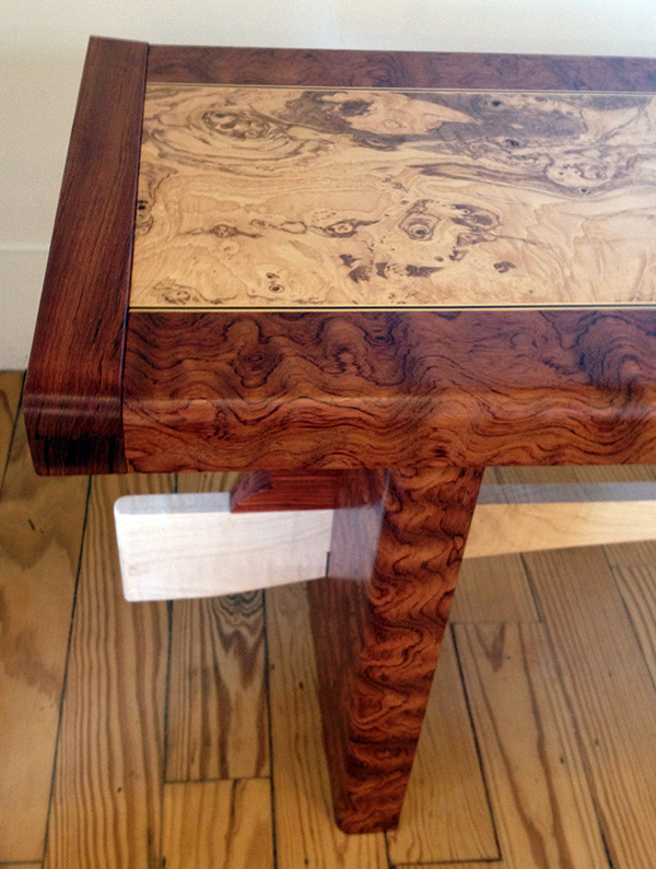 I think the wood can tell a great story but less is more when considering figured wood. A highly figured board can be stunning, but when exploited to cover every inch of surface in the piece, that lovely figure becomes distracting and even tacky. Now when the designer decides to contrast with a different species and makes that one figured as well. It’s like wearing stripes and plaid! You certainly don’t need an additional pop of inlay to punctuate the chaos between those conflicting figures as that just confuses a lost cause.