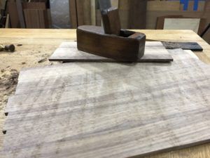 I demonstrated the use of a toothing plane to prepare the substrate and the veneer. This step is optional and I definitely would not tooth a thin, commercial veneer. I do however find that you get a much stronger glue bond and even an easier time during the hammering process getting everything to stick on place where you want it with that additional texture from the toothing plane. I should be clear that this is NOT the toothing planes that you can buy from Lie Nielsen and Lee Valley. Those blades are for coarser work and toothing a surface before hammer veneering is not about removing a lot of wood at all. The vintage toothing planes have a very fine, saw tooth looking tooth to them and create tiny shavings and remove almost nothing from the thickness of the board. I make 3 passes with the toothing plane: directly across the grain, then diagonally in each direction making a cross hatch pattern on the board. With shop sawn veneer that is 1/16″ or thicker I will tooth the veneer in addition to the substrate.