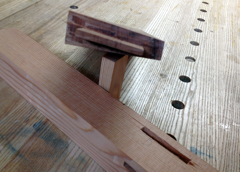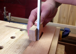 On the converse, the inline tenon requires an angled mortise. This scares a lot of people in both the hand tool and power tool camps. I submit that the joint isn’t hard to cut at all and when done by hand, no special sleds or jig (other than a scrap block) are needed. I grabbed a small black and planed in the angle of the splay then used it as a guide for my mortise chisel. One the initial pass is made with the chisel, chopping deeper is guided by the wall of the mortise already established. In the end, I found it no more difficult than chopping a square mortise.