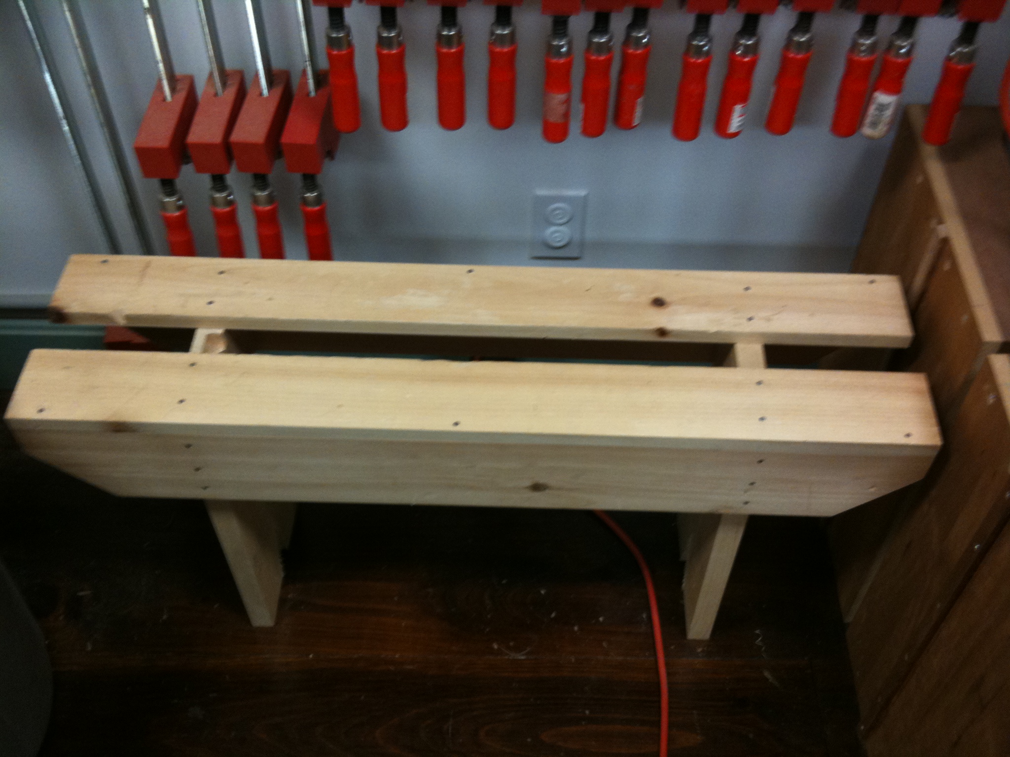 The real highlight of this trip up to PA however was after the show when I met my friends Mark Hochstein (@Loogie on Twitter) and none other than the famous Kari Hultman of The Village Carpenter.  Kari had us over to dinner at her house and we had a great time talking about just about everything with plenty of woodworking thrown in.  For dessert we got to hang out in Kari’s shop and play with her new googly eye magnifier glasses and all of her amazing tools. There is so much to see and play with in Kari’s shop but one thing that caught my eye was her sawbench.  Kari will tell you that this is certainly not an original design as you will find versions of it all over the internet.  The timing for me however was perfect as I was just finishing up the filming of my second lesson in The Hand Tool School that was all about sawing.  So of course being a blogger I had to snap a photo to share with you all.