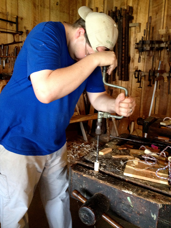 Now the hard part. A stepped through hole right through the tough end grain. My gedge pattern bit is a bit dull and I’m too in the groove to stop and mess with that problem child. No worries, I have a nose auger that is ready to go. First a 5/8″ hole bored to about 1″ deep. I place my forehead on the brace pad so I can sight down the auger shaft and get a square hole. Now switch over to a 1/4″ bit and bore through the 6″ long blank to just past the halfway point. Stop to check for square and plumb along the way. Now flip the blank and bore through with the same bit to connect cleanly with the first hole. It is pretty satisfying when the holes meet up nicely deep inside the blank. It’s nice to know you can bore a hole so precisely with these ancient tools and a little practice.