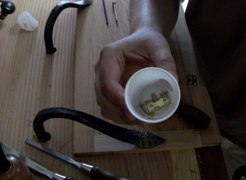 When it comes time to install hardware on your next project, take a minute and drop all of it into a jar, cup, Tupperware, or whatever.  Be vigilant and drop the screws and hinges back into the cup each time you test the fit of a mortise, drill, or pre-thread the screws.  That way no matter what happens to interrupt you in the process, you always know where your hardware is.