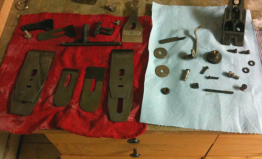 How many times have you started a project and had to set it aside to tackle something else only to completely forget about the original project? I was doing some Spring cleaning in my shop this weekend and stumbled across a container filled with vintage plane parts, blades and Evapo-Rust. Suddenly I remembered the old Stanley planes from my mother-in-law’s basement that I started to clean up 6 months ago. Uh oh, these parts have been soaking for 6 months in rust remover! Well apparently, that isn’t a problem and these blades couldn’t be more free of rust. The parts where the rust was the worst have a dark stain to them now but the steel is clean as can be.