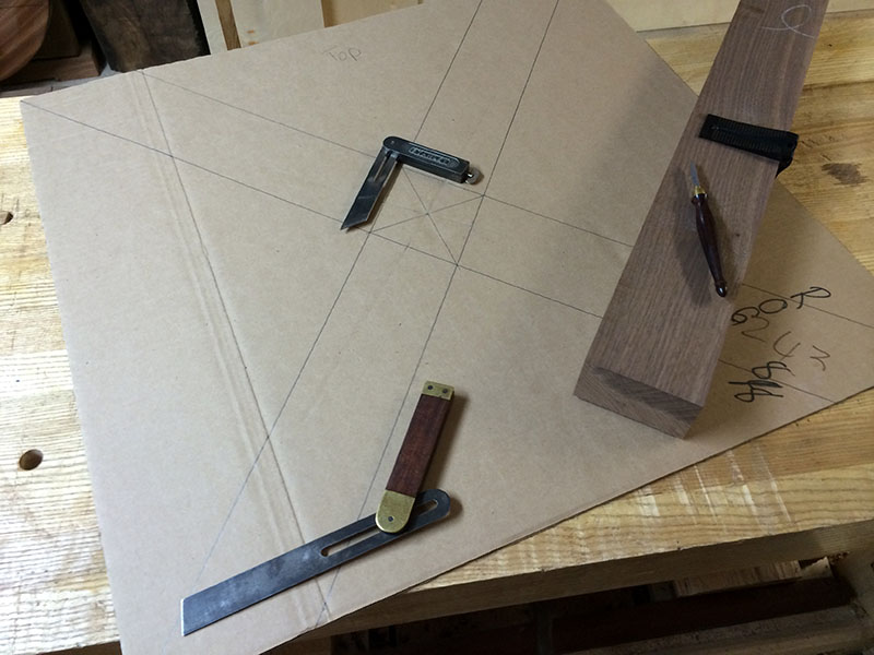 So out comes the pencil and straight edge and some cardboard so I can make a full sized drawing. This not only makes it super easy to capture these unknown angles with a bevel gauge, but it also makes the design more real. It may look great on the computer screen, but until I get it full size I can never quite tell how it will look and feel. Moreover, for something functional like a dining table it is hard to see how the piece will interact with the human body until you have something full size.
