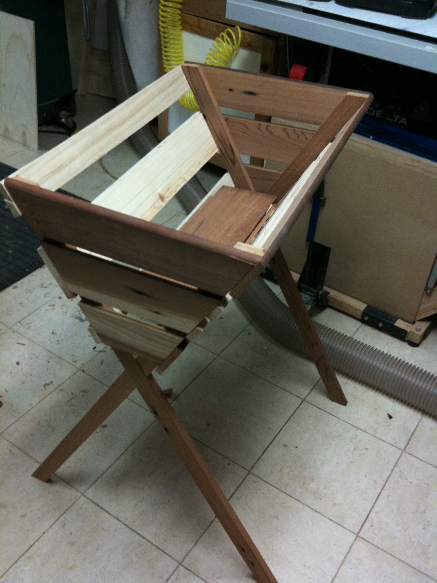 A quick dig through my wood stash yielded some 5″ wide reclaimed Redwood left over from Adirondacks I made this summer. A pass across the 6″ jointer, run through the planer, rip to width on the bandsaw and I was back at my bench a few minutes later with the parts I needed to make a manger.