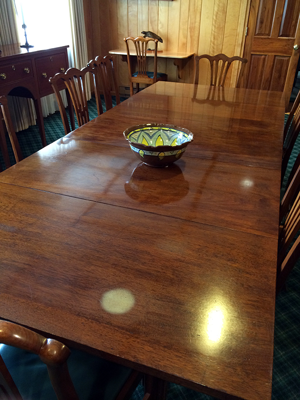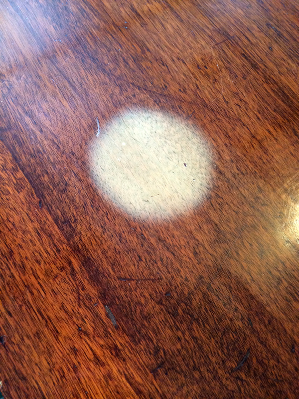 At the lumber yard where I work, we have a lovely conference room upstairs filled with actual antiques. Seeing as the company has been run by the same family since 1798 there have been some pieces passed down over the years that have come to rest in this room. It is in this conference room where our story takes place. Specifically on the end leaf of our long conference/dining table. Let’s just say I’m glad I’m not the one who did this, but I’m told by our CFO that someone put a hot bowl of soup down on the table. Not directly but rather on a paper plate then on the table. I’m not sure how long it stayed there but this is the result. I was always told this white cloud was a sign of a lacquer finish but I could be wrong and I hope someone will correct me if that is the case.