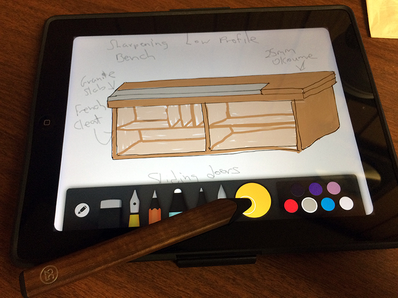 Over the last year I have been using an application on my iPad called Paper by FiftyThree (sorry Androider, I think it is only iOS). This allows me to randomly scribble out an idea and I have a virtually infinite space to change or add on to my idea. Paired with their Pencil drawing tool I have the same feeling of drawing on paper (or a napkin) but now I can play with colors and do all kinds of artsy things like shading and blurring while mixing colors on a palette. This is all techno geeky stuff that honestly keeps my luddite, hand tool way of building in karmic balance.