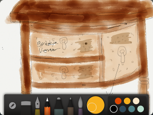 It is also super easy to make changes to a design either by swiping to a new page or by erasing and adding on. When I’m using this app I’m usually much further upstream in my thought process than when I’m working in SketchUp. That’s where I figure out proportions and such. With Paper, I’m more about lines and functional concerns and big picture stuff. I find that it is necessary for my own creative process to break that up. Too often I get focused on minutiae when in SketchUp or limited by my own ability to work the program. Here I’m just coloring or sketching and the app is smart enough and sensitive enough that it feels just like working with pencil and paper to me. My artistic abilities are lacking but I find that the more I use it the better I get at realizing what’s in my head.