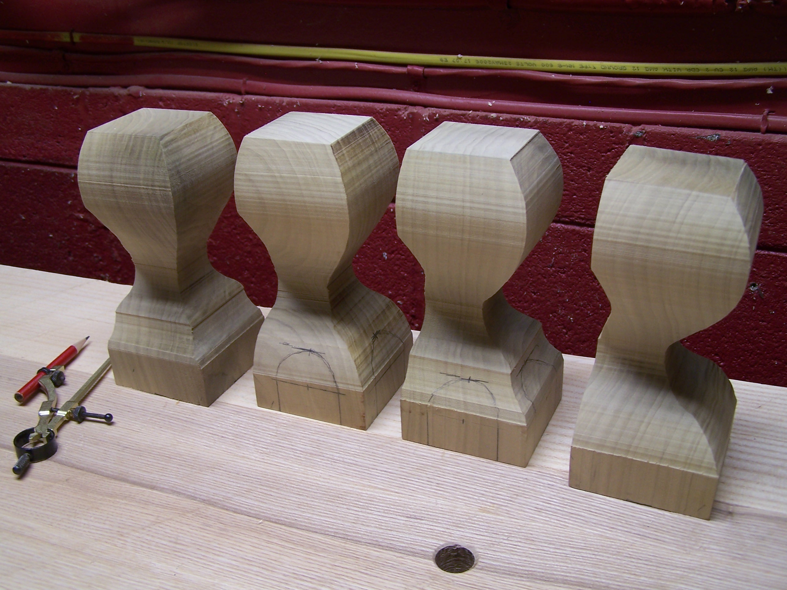 I cut one of these feet by hand while working at The Steppingstone Museum using a turning saw. I cut the other 3 by band saw using a 1/4″ skip tooth blade. One took 4 hours with visitor interruptions and burned a lot of calories in 95 degree heat. The other 3 took 15 minutes and came with musical accompaniment by The Grateful Dead in a cool shop with a Golden Retriever coaching me