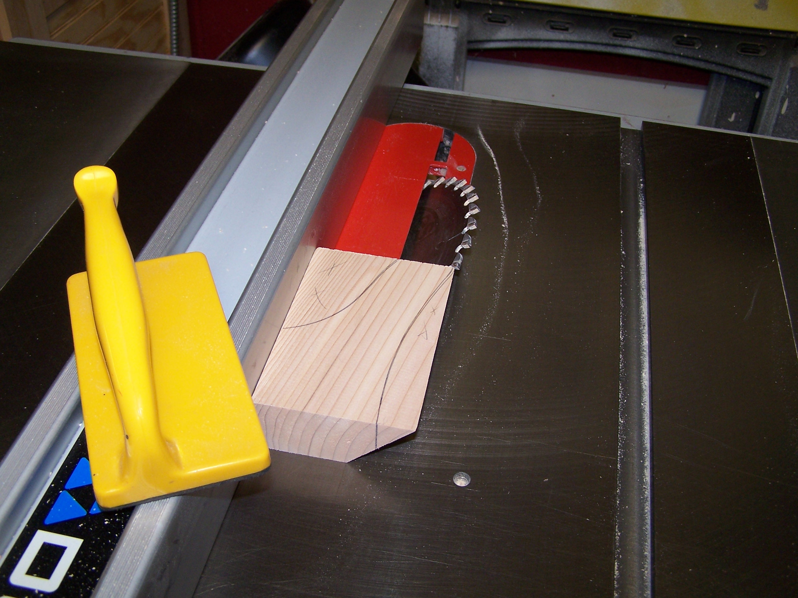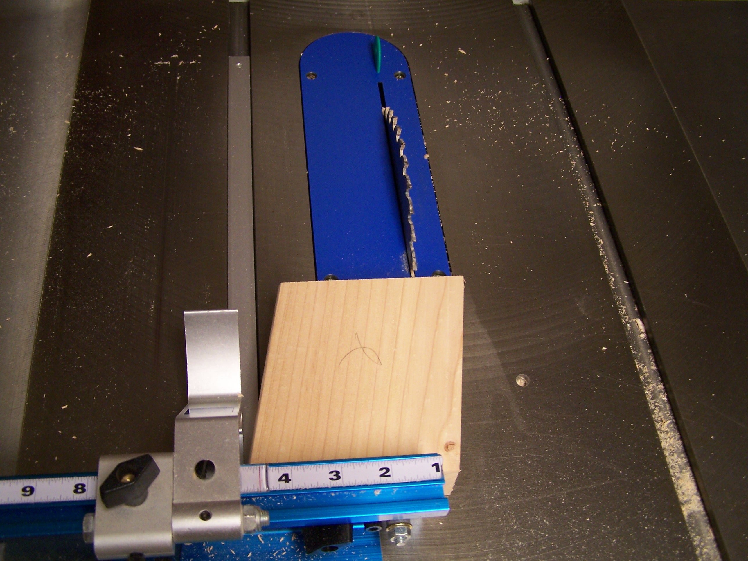 Now that I have the grain aligned for the best strength it is time to begin cutting the feet to size and mitering them into the typical bracket foot. I need a 90 degree edge on this parallelogram so I clip off the back edge of the blank using the miter gauge at the table saw.