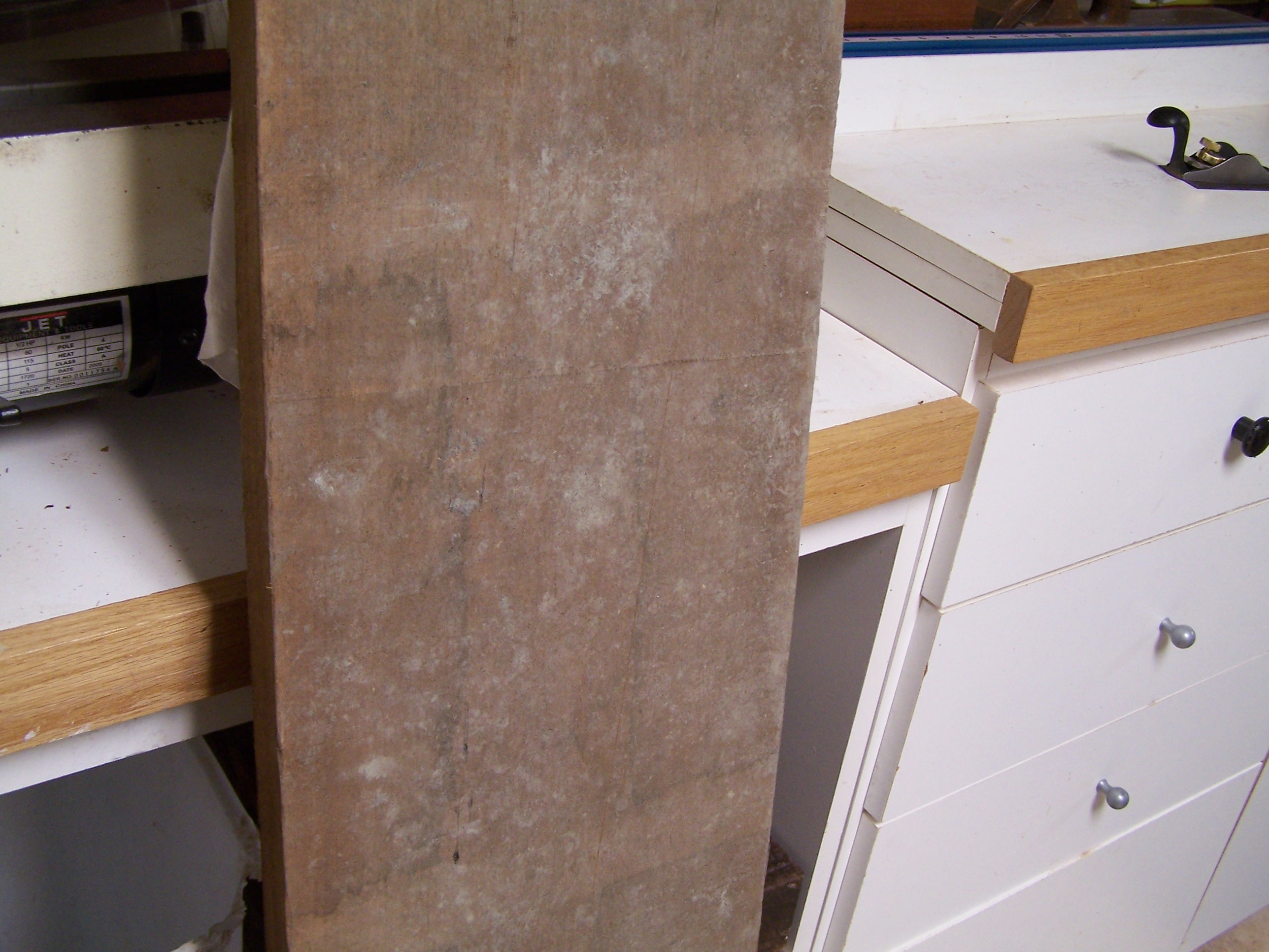 Remember this mystery board? I pulled it from the dumpster at the back of the yard while taking photos for our new web site. It’s been sitting in my shop waiting for an opportunity to be cleaned up. The first step was to take a stiff bristled brush to the board and clean off the dirt. Dirt is basically ground up rock and organic material that will kill the edge of your plane blades in a heartbeat. If you are really concerned about it, you can spritz the board and wipe it down but I find the vigorous brushing to be plenty sufficient.
