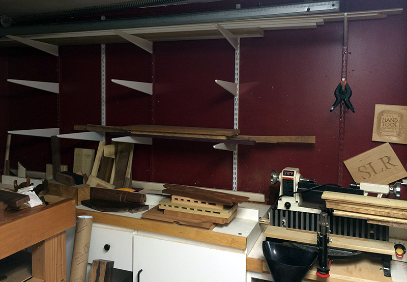An hour later and I had several racks on the wall and a lot of empty shelf space to store my stash. The hardest part was schlepping all that lumber around the house to the shed, but by my calculations I have regained 40 square feet in the shop or more important, 320 cubic feet since the lumber stash dominated the entire wall.