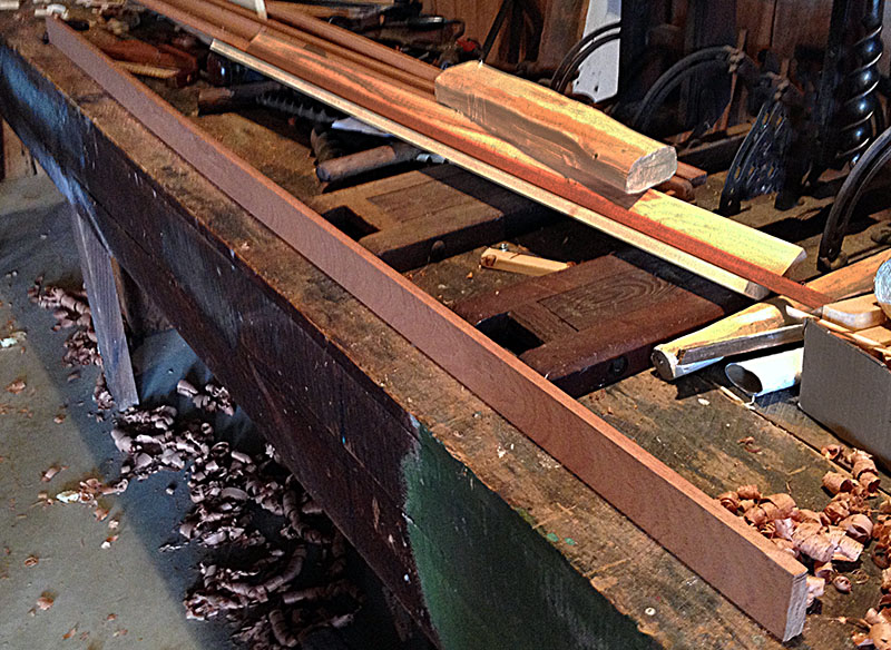 So for a few years now I have shunned any metal bench implements other than my holdfasts…until this weekend. I worked at the Steppingstone Museum both days this weekend and brought along some mouldings that I needed to stick. Two or our continental benches just aren’t long enough for the 9 foot boards I was using so I move over to our Nicholson style bench that is about 15 feet long. This bench doesn’t have any vises or dog holes but it does have one of those metal toothed stops that you can raise and lower with a whack of the mallet. I was dubious but faced with no other alternative so I raised it up about an inch and placed my 7/8x4x9′ board on edge to be jointed. I would have much preferred my leg vise back at home for stability on this kind of board and was worried that I would be in for a shaky ride with this single stop.