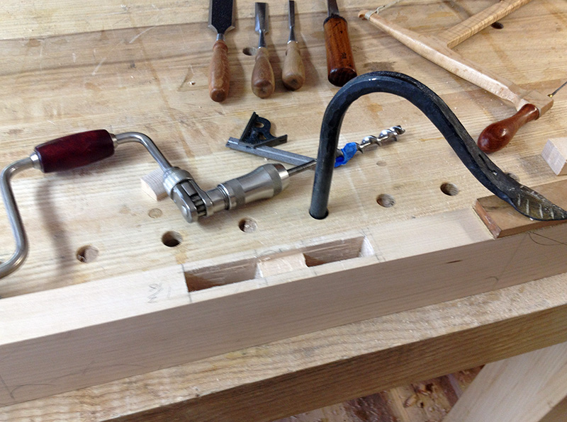 Where and when I use this technique still requires some thought, but it is just another thing to tuck away for the future. Choosing the best tool for the job takes on a new meaning when working in really hard wood. Sometimes the tool changes or sometimes you change the process slightly as in this case. I chop mortises pretty quickly to the point where I have forsaken the auger method for anything narrower than about 1/2″. In this case it would have taken a long time using a 1″ bench chisel involving nibbling away little by little and making frequent trips to the sharpening bench. Instead with a 1″ auger and brace, some light chisel paring, a bowsaw, and half the time and abuse to me and my tools, I arrived at the same destination.