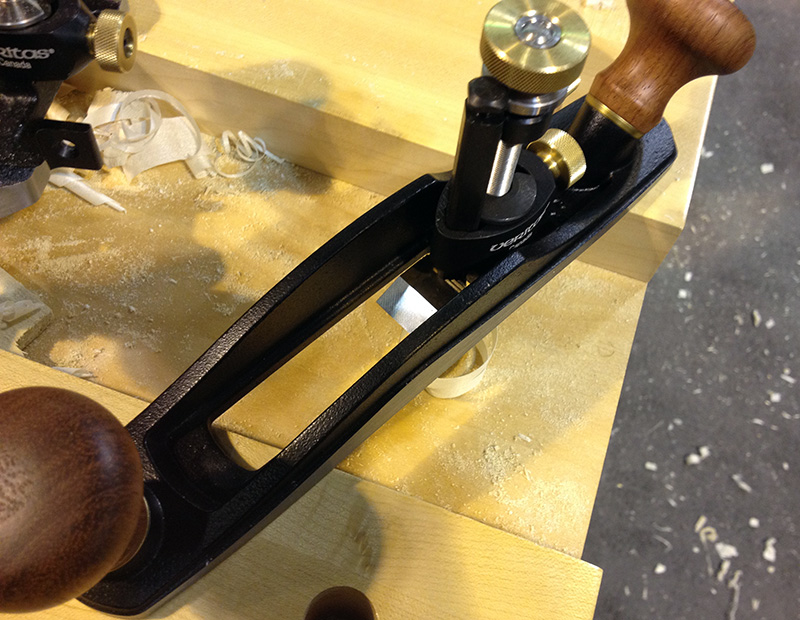 Veritas Butt Mortise PlaneLee Valley/Veritas is always full of great ideas and they take an innovative approach to hand tools. They are releasing a Butt Mortise plane which is a highly specialized tool for making hinge mortises with perfectly square edges to a precisely controlled depth. Lie Nielsen has had one of these on the market for some time and Deneb Pulchalski did a good video of it in use. Personally I have never found a use for this tool as the same task can be done quickly with a chisel and router plane. Veritas has taken this chisel and router plane idea and made their Butt Mortise plane to function much like their router plane, in fact it uses the same blade set up with a faceted post. So while I don’t put much stock in a specific hinge mortising plane, I can see some uses in using this plane to trim tenon cheeks or half laps where a wider wheel base is needed. Even throwing the plane out of the equation, I could really see some benefit to buying only the blade (I’m told this will be an option) which is 3/4″ wide and inserting it into my existing Veritas router plane so I could more quickly level the floor of wider dados and tenon cheeks. Maybe there is finally an answer to the “kickback that wouldn’t die” from WoodTalk and we finally have a solution to trim tenon cheeks that everyone can agree upon.