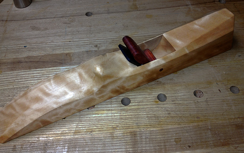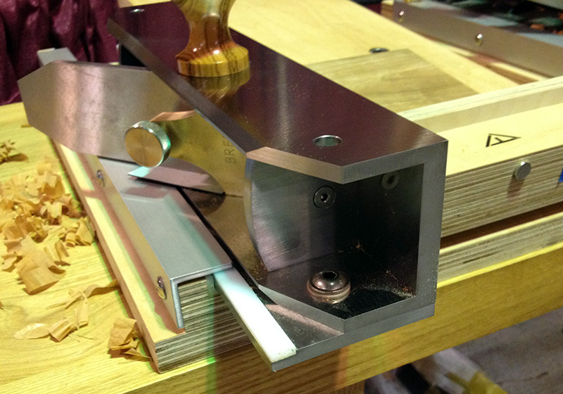 Scott Meek JointerI have said so much about Scott Meek’s wooden hand planes before now and I have 3 of them that get daily use. What else is there to say other than what are you waiting for? This year I spent a lot of time at Scott’s booth to help him out when he needed a break. I was supposed to cut some mouldings using my Time Warp Toolworks planes but the opportunity never came up. Frankly this was because too many people were ga-ga for Scott’s planes. He has changed the design a bit on his larger planes to include a very organic looking hump (I prefer to call it a nipple) right behind the wedge. This cradles your hand and make it very comfortable to use. While I was using them I couldn’t help but notice how naturally my hand fell into position without thinking about it and how easy it was to use the plane. Scott’s design not only directs the force exactly where you need it, he has put a lot of thought into body mechanics and how one holds these planes. I seems as though Scott has unlocked the perfect hang angle for a plane. Maybe it is because he has spent so much time in close proximity to great saw makers. This year Scott had Bad Axe Toolworks on the left and Blackburn Toolworks (my source for resaw frame saw blades) on the right. I came away with one of Scott’s small jointers and have already put it to work in my own shop jointing the backs of some crown mouldings I made for a commission. You can really plane for hours without fatigue using this plane because it fits so naturally. The one I have is left handed even!