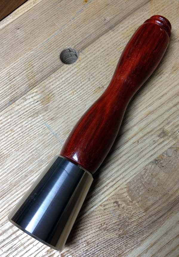 shenandoah toolworks malletNorm Reid and Jeff Fleischer started up Shenandoah Toolworks earlier this year because they wanted a better quality mallet for carving. Jeff is an accomplished carver and Norm is just one smart guy (Hand Tool School member) and both of them has a love of 18th Century furniture and its carved elements. In fact Norm is right now working on a reproduction of Thomas Jefferson’s lap desk on which he supposedly wrote the Declaration of Independence. I was excited to see these guys at WIA because I was fortunate to get one of their 1 lbs mallets in my hand months ago when Norm came to pick up some Mahogany from me at the lumber yard. I have been putting it through the paces and am really happy with it. The handle has two natural places to grip it whether you want power or finesse and the balance is just about perfect to use it easily. The angle on the mallet head is precisely determined so that you direct all the force of the blow right into the chisel our gouge you are using. Not just for carving, these weighty beauties can chop mortises with the best of them. I had their 1 lb version close at hand while I built my treadle lathe and it was there for every mortise and bridle joint. At WIA, I picked up the 1.5 lb version for a little more oomph on mortises. I really like the slightly extra kick this heavier version provides when I choke all the way up on the handle and use it for carving. The weight means the mallet does all the work and I don’t find myself having to even try to use it. The ergonomics and balance are such that it feels like it works all by itself. Shenandoah Toolworks also has some cool Chip Carving kits available too. stamp and chipThey aren’t up on the web site yet, but Jeff, an accomplished chip carver, has created some nice practice patterns in rubber stamp form that allows you to quickly and accurately layout patterns on your board in an instant so you can get right to work with the knife. I have never seen this before and it is a really intriguing option for the person wanting to dive into chip carving or perhaps the craftsman that does a lot of standard chip carved borders where he will want to layout the same thing time and again.