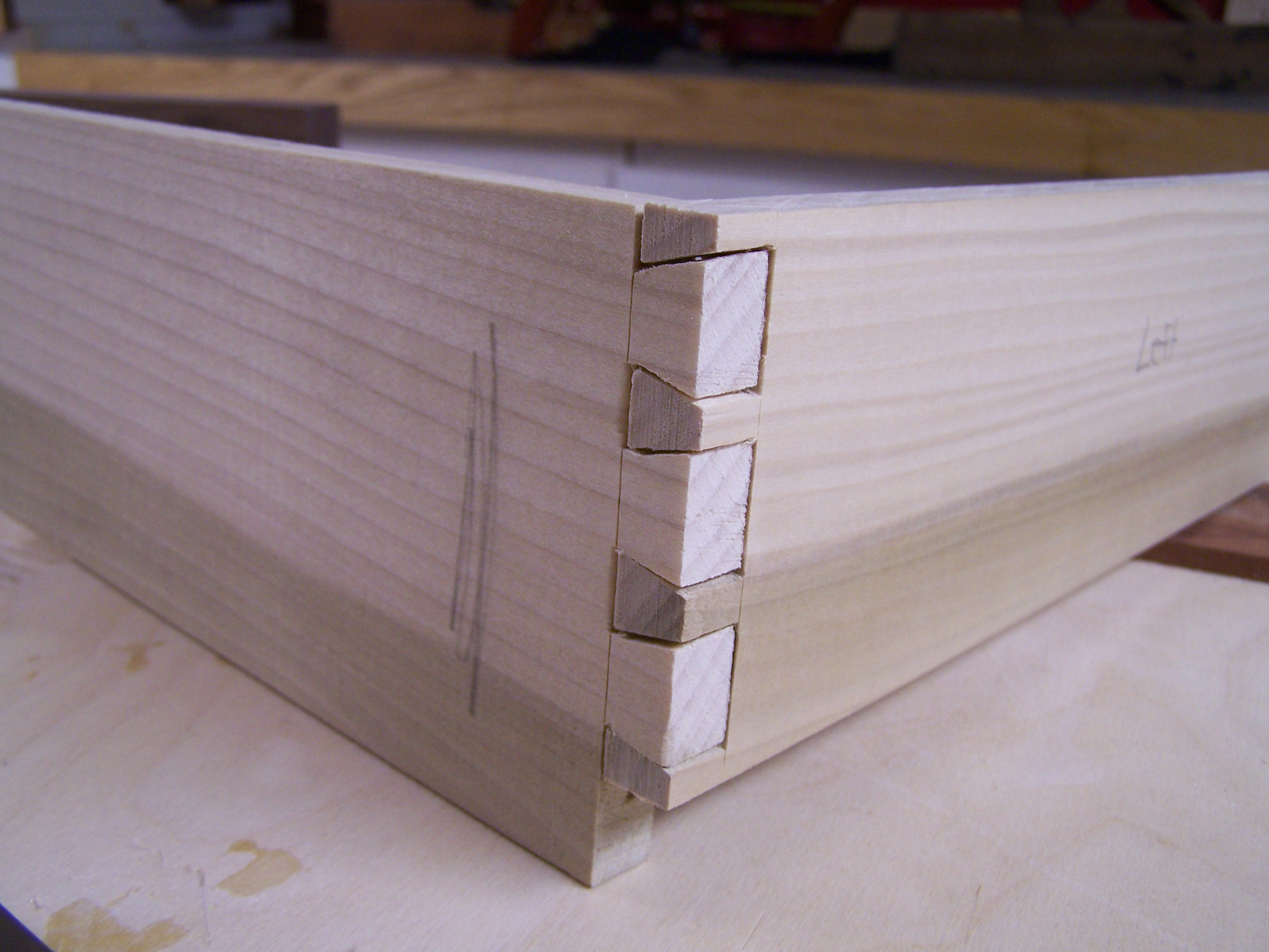 I feel pretty good about my dovetail joints.  Occasionally I mess one up beyond repair, but for the most part they come out tight fitting and without gaps.  I can cut pins or tails first and really change it up depending on the situation.  For instance when making drawers I like to do tails first so I can gang the drawer sides together then cut them all at once.  For carcass work I prefer pins first probably because that is the way Chuck Bender taught me.