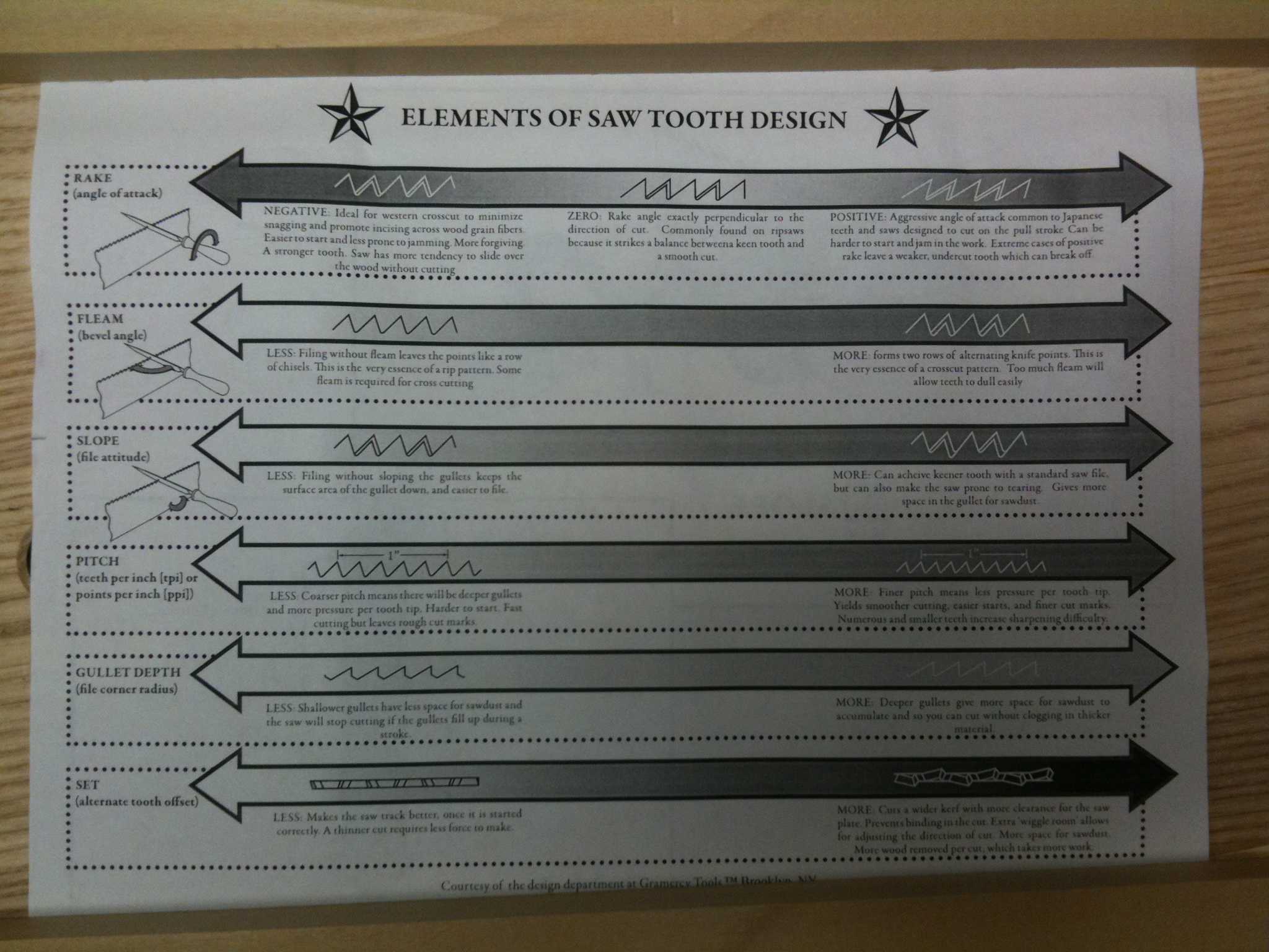 My recent saw sharpening video where I demonstrated the Veritas Saw File Holder has generated a lot of emails with questions about saw tooth geometry. I take this as a good sign that lots of people are actually thinking about sharpening their own saws. Not only that but the introduction of filing guides like the Veritas and the Rakemaker II by Blackburn Toolworks (a great site to check our for more info on this subject) have people thinking in detail about what tooth geometry is best for their work. These little guides open up a level of filing accuracy only previously attempted by saw filing experts. Of course with this comes questions about how this saw tooth geometry actually works. What degree of rake and fleam are best for me?