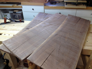 Well long story short, my frame saw passed the test with flying colors! In fact I estimate I was cutting about 1″ per minute with this saw. I set up a stop watch and started sawing. Every 4 minutes I switch sides in order to better control the alignment of my kerf (and rest my muscles). On Friday in the time of 46:27 of actual cutting time, I was able to cut away a 1x24x52″ slab. On Saturday, I repeated the process and sawed away an identical slab in 52:48. I think the blade was getting dull in the final foot of sawing on this second cut. I’m left with a 3/4″ thick slab of Walnut to add to my lumber rack since I only needed two pieces for the drop leaf table I’m making.