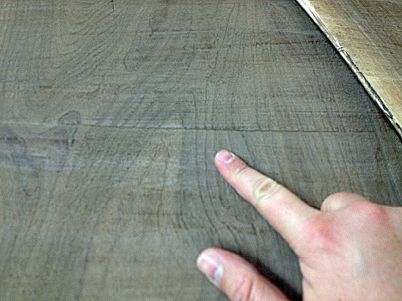My second time around, I made my first cut as planned, then started on the other end. This time after I had sawn in about 1/3 of the way, I stopped and connected my kerfs down the edges using a typical 26″ hand saw. I sank this “guide” kerf about 1/8″ deep then clamped the whole slab vertically for sawing again. While these kerfs won’t allow you to saw on auto pilot they do stack the cards in your favor by giving the saw a suggested exit point. My resulting second resaw met exactly and the boards came apart with no effort. In fact the tiny ridge shown is not a factor of misalignment but rather the start of a new kerf when the boards suddenly clamped together under the pressure of my leg vise and my saw kept moving forward for half a stroke.