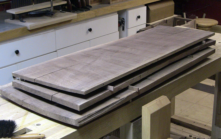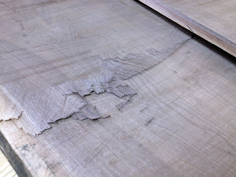 The biggest lesson learned from these big cuts is how much a tiny deviation in alignment can add up over the course of a big board like this. Standard practice is to saw in from each end to the halfway point and have your saw cuts meet in the middle. After sawing in from one end during my first attempt, I started on the other side. I realized about 15″ into the cut that I was drifting a bit on one side and began to “steer” as best I could to straighten out the cut. Unfortunately with only about 8″ left to saw through I was not able to correct completely so I kerfs did not meet and I had to lever the two pieces apart with my Froe. This left an ugly looking flap in the middle. Fortunately this was quickly cleaned up with a Fore plane and I had a flat-ish face to reference my marks for the second saw cut.